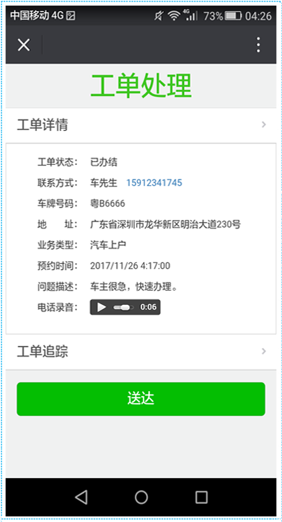 現(xiàn)場(chǎng)辦證人員無需下載APP, 直接在手機(jī)微信上完成工單處理全過程。業(yè)務(wù)流程完全按照車管業(yè)務(wù)模式設(shè)計(jì),包括:搶單接單、上門提件/提車、辦理、辦結(jié)、送達(dá);支持拍照或文件資料上傳下載,支持在線支付、客戶掃碼評(píng)價(jià)。