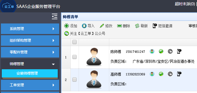 步驟:?jiǎn)螕魩煾倒芾怼鷨螕舭惭b師傅管理→添加。按步驟填寫師傅信息(姓名,電話,地址,負(fù)責(zé)區(qū)域,技能證書,技能證書師傅可自己在微信上傳)→保存(系統(tǒng)自動(dòng)發(fā)送邀請(qǐng)通知)→師傅掃碼并關(guān)注”云工單”公眾號(hào)→師傅綁定到企業(yè)賬號(hào)即可。
