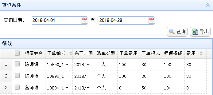 步驟單擊統(tǒng)計(jì)分析→師傅績(jī)效→輸入查詢條件→師傅績(jī)效。