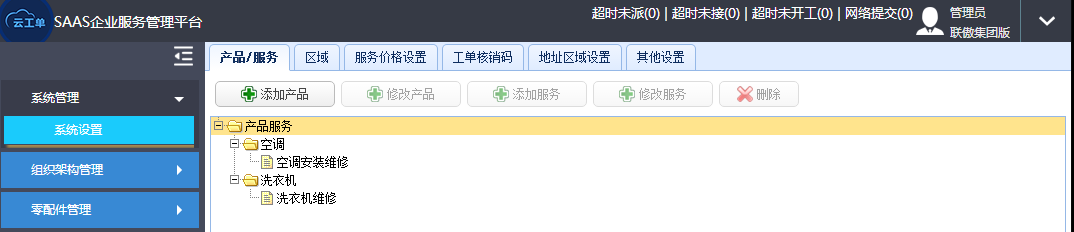 2》系統(tǒng)管理設(shè)置:   產(chǎn)品/服務(wù),地址區(qū)域,服務(wù)價(jià)格設(shè)置。