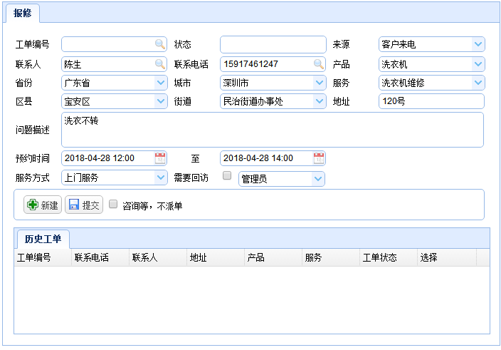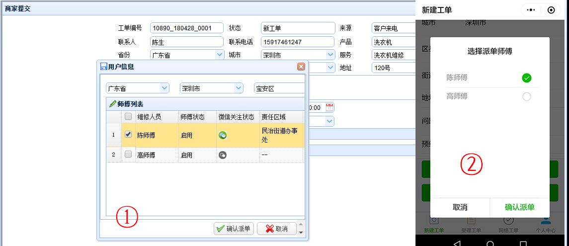 步驟:單擊工單受理新建工單工單建立界面(工單編號(hào)和狀態(tài)不需要填寫)→保存派工 ;紅色①是網(wǎng)頁(yè)入口派單;紅色②是小程序派單。