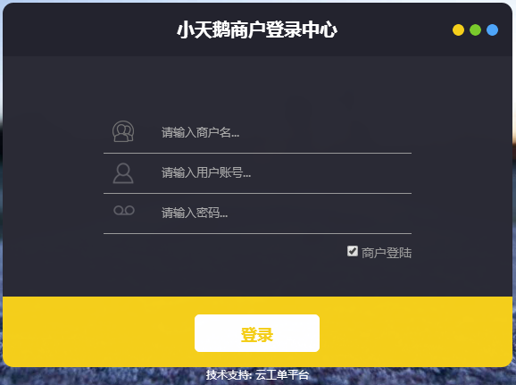 登錄界面默認(rèn)的是企業(yè)登錄界面,在右下角選上商戶登錄即可。如圖:(商戶名:小天鵝洗衣機(jī)維修部  admin  admin