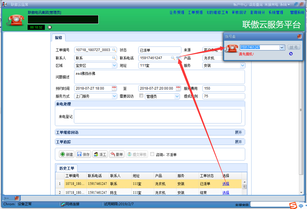步驟:登錄聯(lián)傲云賬號(hào);通過(guò)歷史工單→選擇工單→工單(聯(lián)系電話(huà))→(座機(jī)一定要先“摘機(jī)”)點(diǎn)擊電話(huà)按鈕→撥號(hào)  即可回訪。