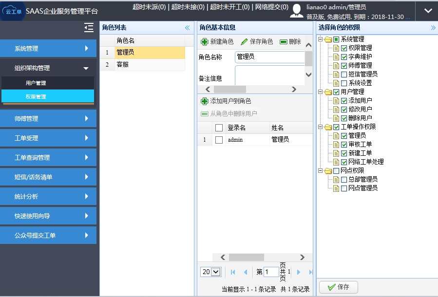 A:工單系統(tǒng)默認(rèn)的角色賬號為“admin”;權(quán)限是最大的,如果更改那么很多其他的角色和模塊都操作不了。