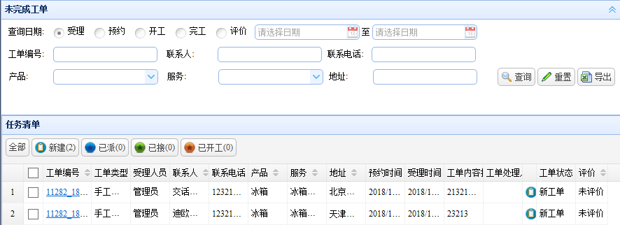 未完成模塊包括:查詢條件、導出功能、工單狀態(tài)管理。如圖: