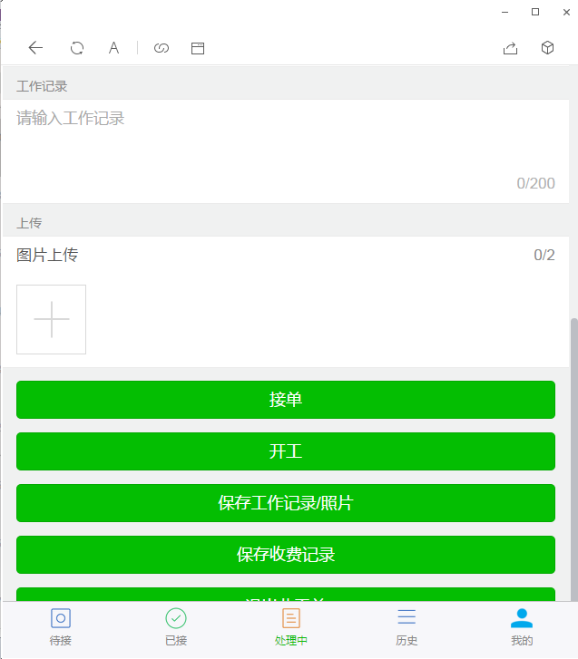 使用步驟:進入到簡化流程后,填寫詳細處理記錄,上傳照片,然后完工即可。