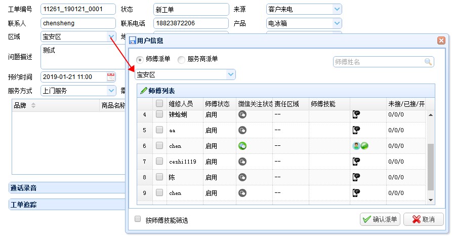 Q:工單系統(tǒng)派單界面沒有過濾出所要的師傅?