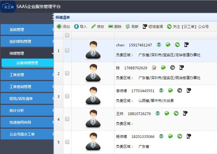 步驟:單擊師傅管理→單擊添加→添加師傅頁面。在添加師傅頁面按要求輸入信息(師傅姓名、手機號、公司、地址、技能領域、負責區(qū)域等),保存,讓師傅關注“云工單”公眾號并綁定到相關賬號。