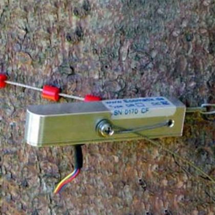 ???? ? DC1是測量植物周長變化的簡單版本。傳感器通過一個由熱膨脹系數(shù)低的合金制成的鋼絲繩固定在樹上。用小塑料環(huán)減少鋼絲繩對樹的壓力,并減少摩擦阻力,大大提高靈敏度。