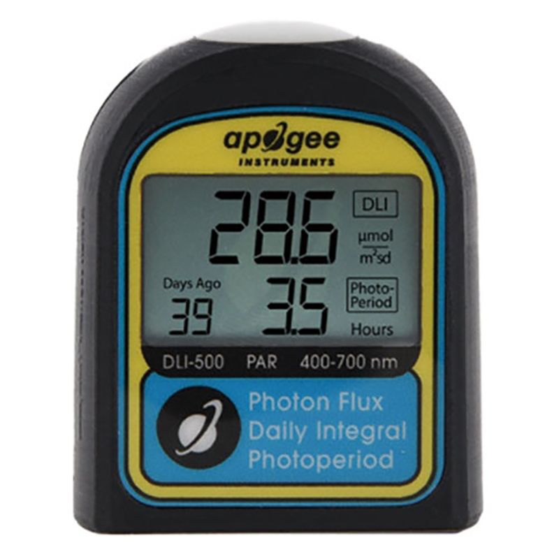 ? ? ? ?Apogee的新型?DLI-500測量儀設(shè)計用于測量 400-700 nm的光合有效輻射 (PAR),并且在各種光源下數(shù)據(jù)精度都很好。如果您正在尋找在陽光和某些寬帶光源下準(zhǔn)確的儀器,請參閱我們的DLI-400型號。除了測量 PAR,DLI-500儀表還計算日光積分 (DLI) 和光周期,PPFD、DLI 和光周期數(shù)據(jù)可在屏幕上查看或通過 USB-C 電纜下載進(jìn)行分析,可直接放在水平面上也可安裝到三腳架、夾具或木樁上。