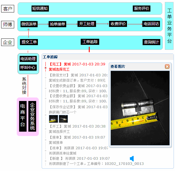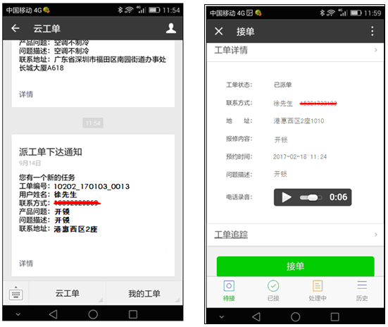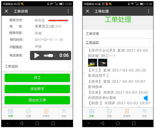 開鎖人員可直接在微信上查看處理工單,支持接單、開工、完工、拍照、填寫處理記錄、收費、客戶評價等。