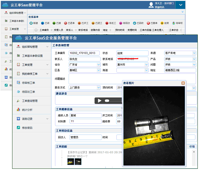 云工單提供客服電話管理、工單受理、短信通知、師傅加盟、微信派單、搶單接單、工單處理、拍照上傳、工單跟蹤、電話回訪、在線支付、客戶評價、查詢統(tǒng)計等全面的功能,為鎖業(yè)服務管理提供了完善有效的解決方案。