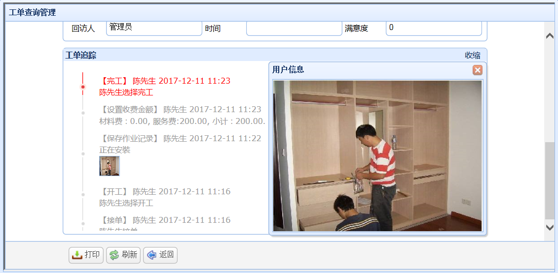 工單追蹤管理:是指管理者能隨時的追蹤師傅/工程師維修工單詳情進度;如,客戶對服務(wù)的滿意度、開工時間、工單完成成果。