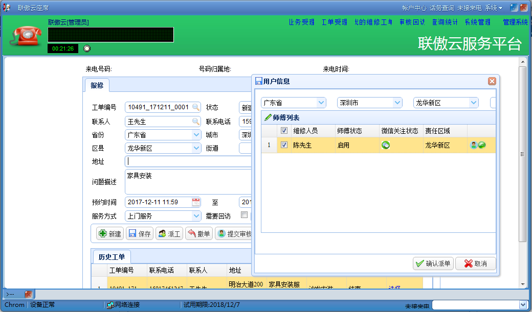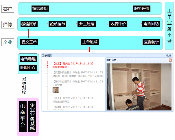 云工單提供客服電話管理、工單受理、短信通知、師傅加盟、微信派單、搶單接單、工單處理、拍照上傳、工單跟蹤、電話回訪、在線支付、客戶評價、查詢統(tǒng)計等全面的功能,為家具配送和安裝服務(wù)管理提供了完善有效的解決方案。